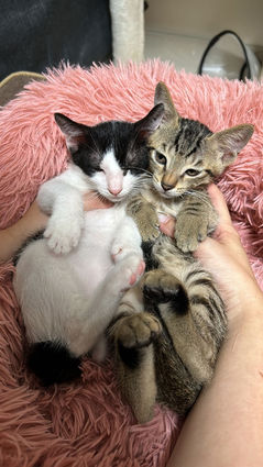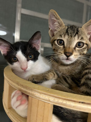黑白叫做牛奶糖,虎紋叫做芝麻糖,要一對領養,因為其中有一隻行遠少少,就會尖叫😂佢哋喺個倉度生活,但係媽媽比狗咬死咗,啲員工就餵佢哋,但係因為就嚟打10號風球,所以員工驚佢哋有事所以搵咗我哋